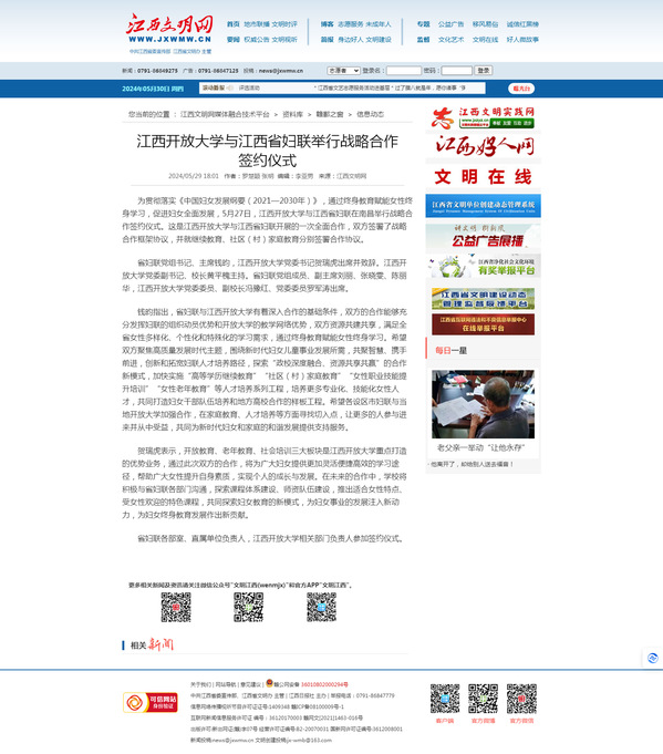 5月27日,江西开放大学与江西省妇联在南昌举行战略合作签约仪式。这是江西开放大学与江西省妇联开展的一次全面合作,双方签署了战略合作框架协议,并就继续教育、社区(村)家庭教育分别签署合作协议。