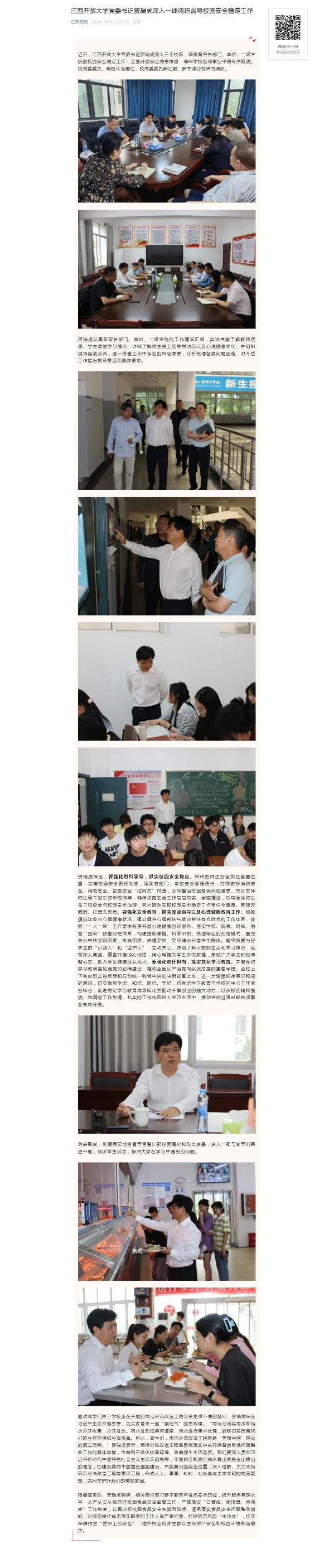 近日,江西开放大学党委书记贺瑞虎深入三个校区,调研督导各部门、单位、二级学院的校园安全稳定工作,全面开展安全隐患排查,确保学校各项事业平稳有序推进。校党委委员、副校长冯豫红,校党委委员熊江鹏、罗军涛分别陪同调研。原文地址:https://mp.weixin.qq.com/s?__biz=MzI1OTM4MDMzMA==&mid=2247590623&idx=3&sn=890b017e8707ef80508e321cf57bf022&chksm=ea7ae7dadd0d6ecc34d69c8a2989749fdb476597314044b5b7a6aa6d50d4dc8f7231efcf9591&mpshare=1&scene=23&srcid=0604IhdFx8INWZB6Nicnp2mD&sharer_shareinfo=27955339751b49c9cd3c3d3dc63b0533&sharer_shareinfo_first=27955339751b49c9cd3c3d3dc63b0533#rd (责任编辑:罗楚颖)