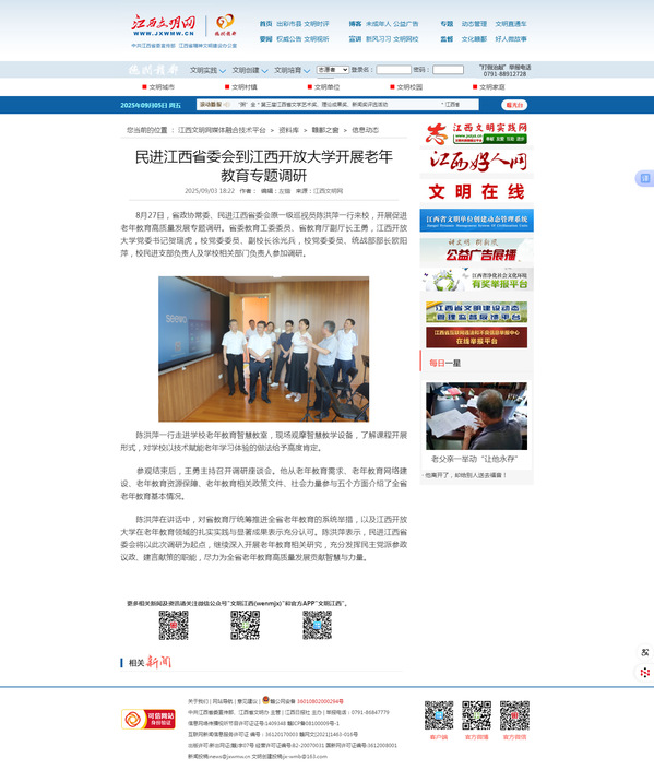 8月27日,省政协常委、民进江西省委会原一级巡视员陈洪萍一行来校,开展促进老年教育高质量发展专题调研。省委教育工委委员、省教育厅副厅长王勇,江西开放大学党委书记贺瑞虎,校党委委员、副校长徐光兵,校党委委员、统战部部长欧阳萍,校民进支部负责人及学校相关部门负责人参加调研。