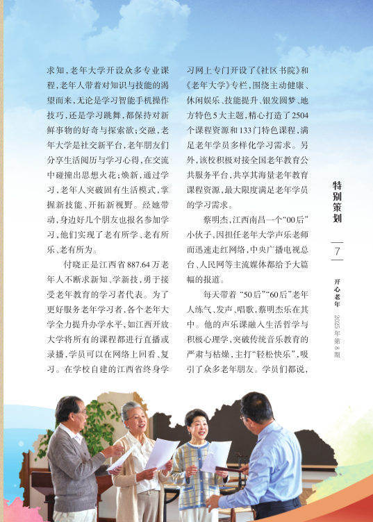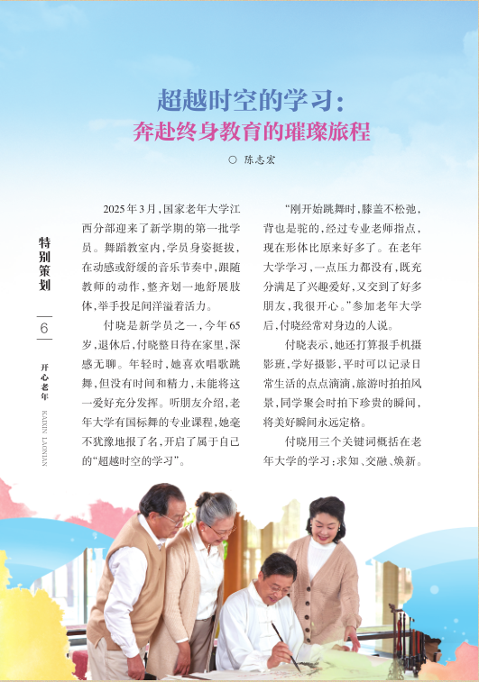 近日,我校教师陈志宏撰写的《超越时空的学习:奔赴终身教育的璀璨旅程》一文,在《开心老年》杂志2025年第8期正式刊发。该文以国家老年大学江西分部(江西老年开放大学)学员付晓的学习经历为切入点,通过“求知、交融、焕新”三个维度,真实反映了老年群体在终身学习过程中的获得感与幸福感。文章还聚焦00后教师蔡明杰通过音乐教学助力银发学员实现“超越时空的学习”的动人故事,体现出代际共融、技术赋能对老年教育发展的积极影响。