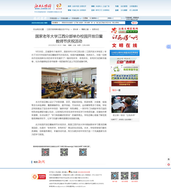 9月10日,正值第41个教师节,国家老年大学江西分部(江西开放大学校区)举办了2025年校园开放日暨教师节庆祝活动。校园内暖意融融、热闹非凡,为每一位期待开启校园新生活的老年学员铺开了一幅老有所学、老有所乐、老有所为的鲜活画卷,也为辛勤耕耘在老年教育一线的教师们送上节日的诚挚问候。