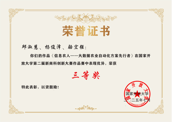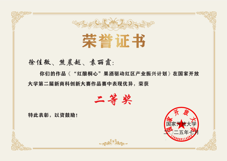 在本次大赛中,徐佳微、熊晨越、袁丽霞同学共同完成的《“红酿桐心”果酒驱动红区产业振兴计划》荣获二等奖。该项目以红色革命老区产业振兴为切入点,围绕特色果酒产品的研发与推广,结合数字化营销手段,探索区域特色产业转型升级新路径,展现了良好的商业思维与社会责任感。邱淑慧、杨俊泽、骆宏强团队提交的《信息农人——大数据农业自动化方案先行者》获得三等奖。该作品运用大数据技术,构建农业自动化管理解决方案,为推动传统农业向数字化、智能化转型提供了有益探索。