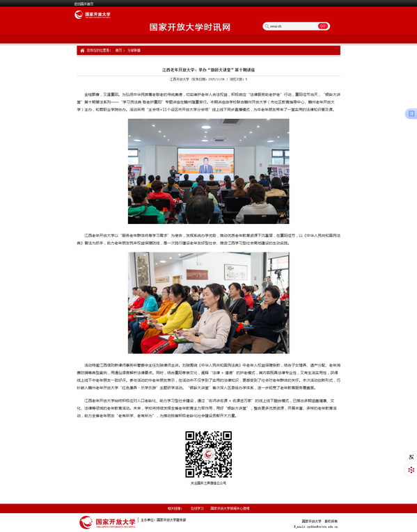 金桂飘香,又逢重阳。为弘扬中华民族尊老敬老的传统美德,切实维护老年人合法权益,积极响应“法律服务助老护老”行动,重阳佳节当天,“银龄大讲堂”第十期普法系列——“学习民法典 敬老护重阳”专题讲座在赣州隆重举行。本期讲座由学校联合赣州开放大学(市社区教育指导中心、赣州老年开放大学)主办,和君职业学院协办。活动采用“主会场+11个设区市开放大学分会场”线上线下同步直播模式,为中老年朋友带来了一堂实用的法律知识普及课。