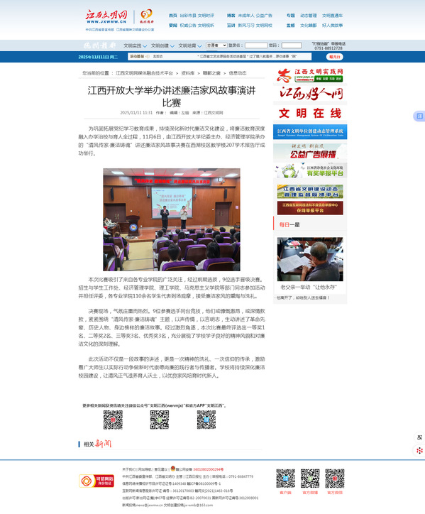为巩固拓展党纪学习教育成果,持续深化新时代廉洁文化建设,将廉洁教育深度融入办学治校与育人全过程,11月6日,由江西开放大学纪委主办、经济管理学院承办的“清风传家·廉洁铸魂”讲述廉洁家风故事决赛在西湖校区教学楼207学术报告厅成功举行。