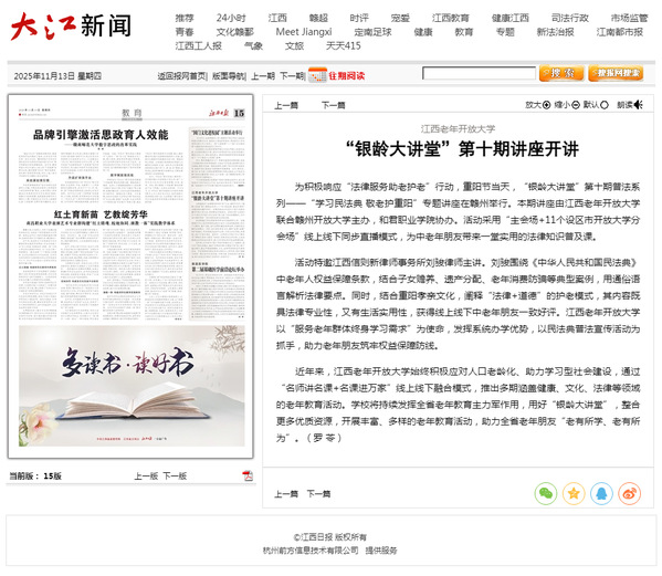 为积极响应“法律服务助老护老”行动,重阳节当天,“银龄大讲堂”第十期普法系列——“学习民法典 敬老护重阳”专题讲座在赣州举行。本期讲座由江西老年开放大学联合赣州开放大学主办,和君职业学院协办。活动采用“主会场+11个设区市开放大学分会场”线上线下同步直播模式,为中老年朋友带来一堂实用的法律知识普及课。