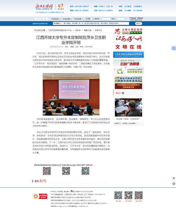 11月21日,由江西开放大学、萍乡卫生职业学院、萍乡开放大学共同举办的“专升本”培训定制班开班典礼在萍乡卫生职业学院润德楼学术报告厅举行。此次开班是江西开放大学体系深化内部协同、联动地市开大精准服务区域人才发展的重要举措。“江开专升本”培训项目在“省校统筹+地市协同”二级联动模式下成功落地,为全省开大体系协同拓展非学历教育提供了可复制、可推广的“萍乡样板”。