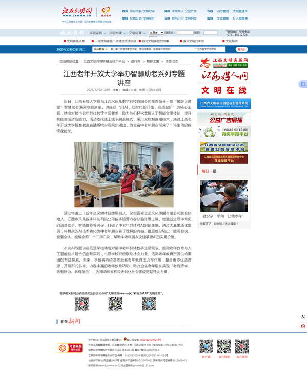 近日,江西开放大学联合江西水孩儿数字科技有限公司举办第十一期“银龄大讲堂”智慧助老系列专题讲座。讲座以“用AI,把时代的门槛,变成台阶”为核心主题,精准对接中老年群体数字生活需求,助力他们轻松掌握人工智能实用技能,提升智能生活适应能力。活动依托线上线下融合模式,采用双轨制直播技术,通过江西老年开放大学智慧教室直播系统实现同步播出,为全省中老年朋友带来了一场生动的数字化教学。
