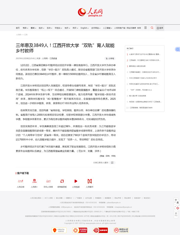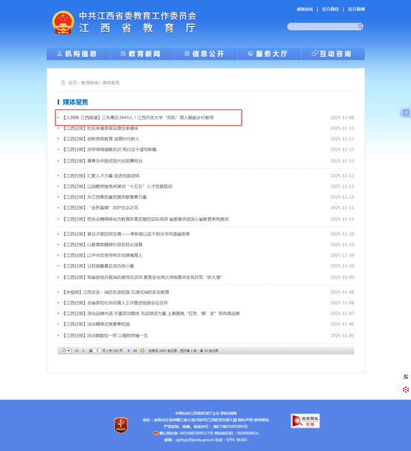 近日,江西省第四期乡村教师培训项目开学第一课在南昌举行。江西开放大学作为承办单位,依托体系办学优势,创新“学历+能力”双轨育人模式,联动全省教育部门及开放大学体系协同推进。该项目已惠及3849名乡村教师,新一期吸引5000名教师加入,为全省乡村基础教育注入新动力。近期,江西教育网“媒体聚焦”栏目转载了我校“双轨”育人赋能乡村教师工作纪实。