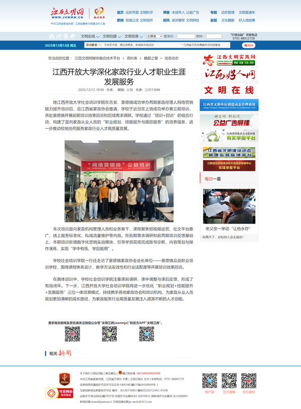 继江西开放大学社会培训学院在吉安、景德镇成功举办两期家政经理人网络营销能力提升培训后,应江西省家政协会邀请,学校于近日在上饶成功举办第三期培训,并赴景德镇开展前期培训效果回访和后续需求调研。学校通过“培训+回访”的组合行动,构建了面向家政从业人员的“职业规划、技能提升与跟踪服务”的培养链条,进一步推动校地协同服务家政行业人才高质量发展。